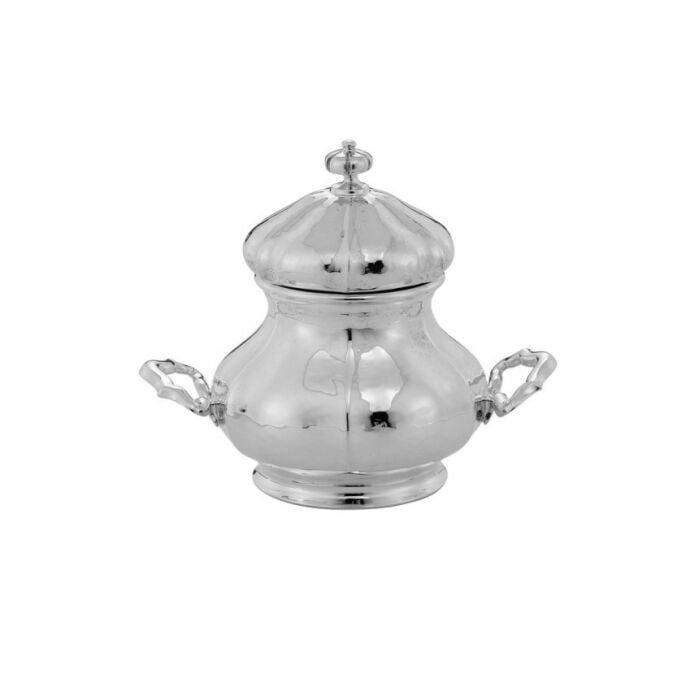 Cukiernica wykonana ze srebra próby 925. Wysoka jakość wykończenia produktu, niepowtarzalne wzornictwo włoskiego designu Elegancja i przepych to cechy charakterystyczne dla tego wyrobu srebrnego. Okrągła podstawa korpusu cukiernicy. Poziome, duże uchwyty zamknięte w pałąk.Okrągłą pokrywka z dużym uchwytem nawiązującym do kształtu samej cukiernicy.