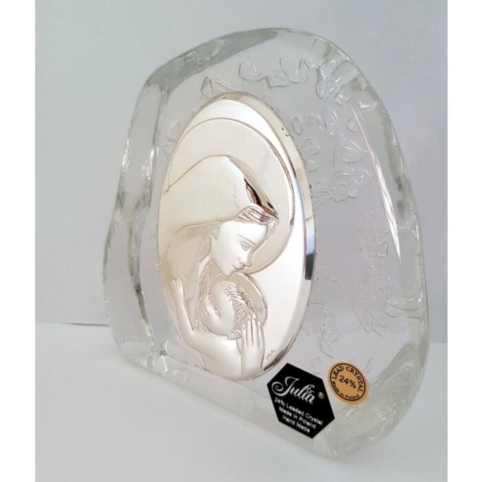 Posrebrzany obrazek z kryształem Matka Boska z Dzieckiem 1 to wyjątkowy i niepowtarzalny prezent na każdą okazję. Wykonany ręcznie w Hucie Julia z wysokiej jakości szkła kryształowego wizerunek Madonny z Dzieciątkiem dodaje mu niepowtarzalnej wartości. Wymiary obrazka to 11 cm wysokości i 10,5 cm szerokości, co czyni go idealnym elementem dekoracyjnym na każdą okazję.